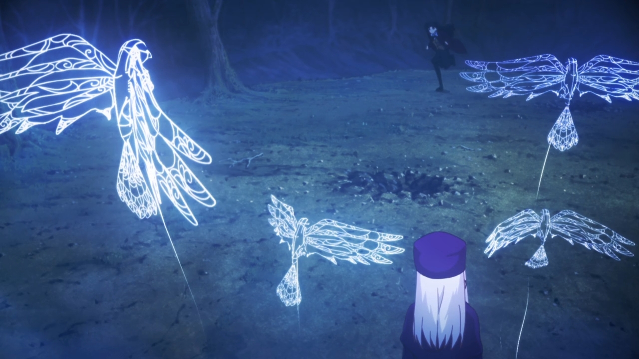 Those bird familiars under Illya’s command look pretty cool. And in her duel against Rin, it’s nice that at least one of them is running and moving about. I tend to not like duels between mages in most stories, because they usually won’t do much but stand there and hurl spells at each other. Having our heroine on the ropes is better than nothing.