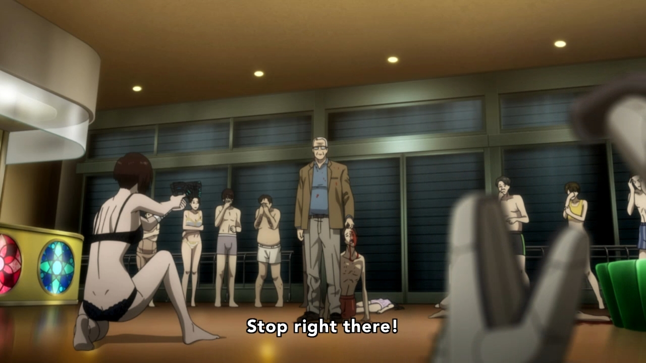— See, that’s why I’m just not a huge fan of the girls all wearing sexy underwear. With the attendant’s help, Risa now has the old man at “gunpoint,” but her butt crack is nevertheless showing because anime is anime. The show detracts from its own seriousness.