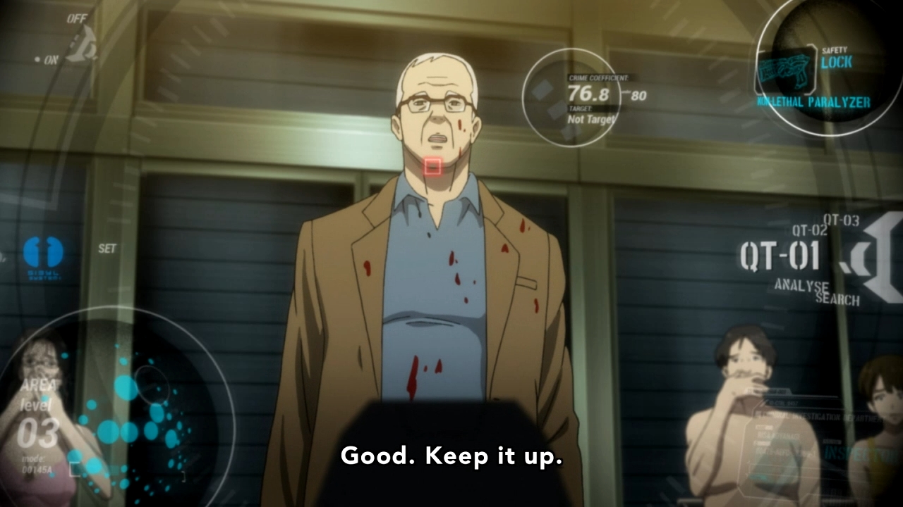 That said, yeah. It seems weird that they would shoot first and ask questions later with such an unusual scenario – and why the hell did SUDDENLY the old man’s Criminal Coefficient raise to Lethal Eliminator levels at the very end?