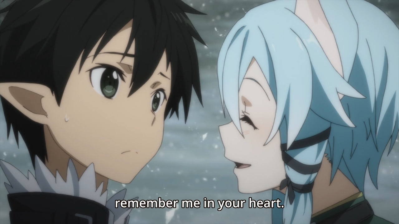 It’s the dumbest thing about her character. They just went through the GGO ordeal, and yet, she has to save his magical golden penis extension to convince him not to forget her.