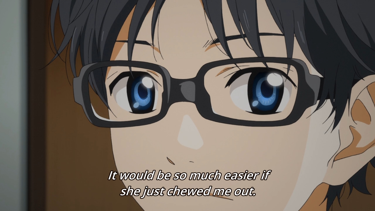 — Kaori’s monologue is just a bunch of self-indulgent bullshit. Can’t we let Kousei make his own decisions? Can we stop deciding things for him? Can’t we allow him to play the piano on his own terms and not because you think he’s meant to live for the same moments that you live for? Is that so much to ask?