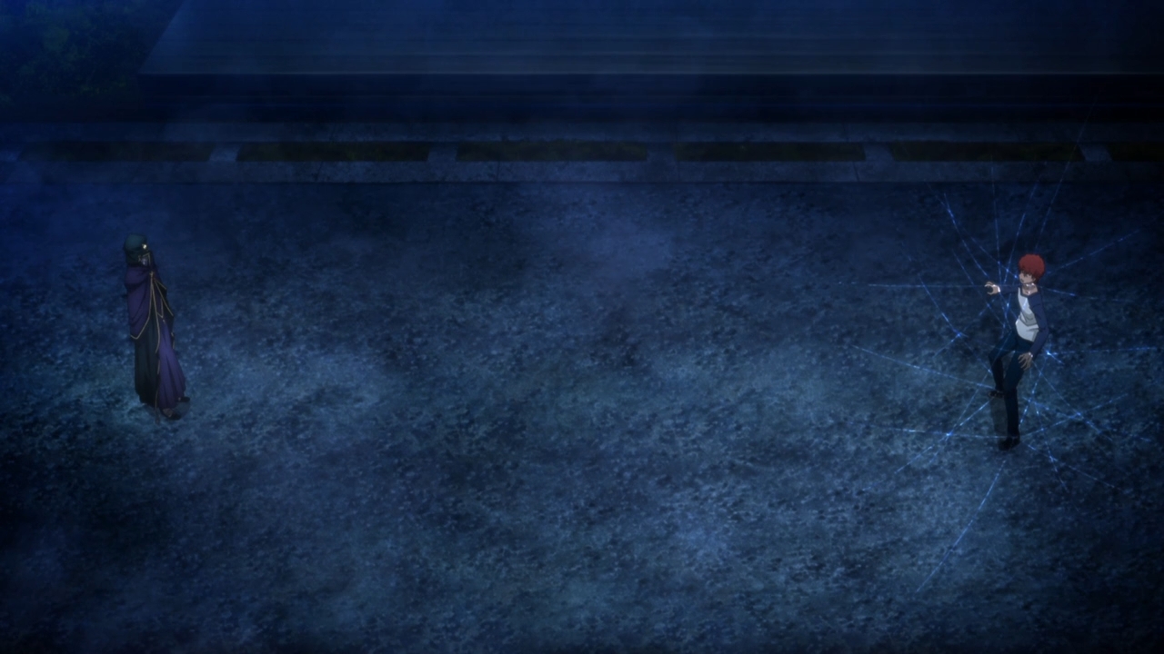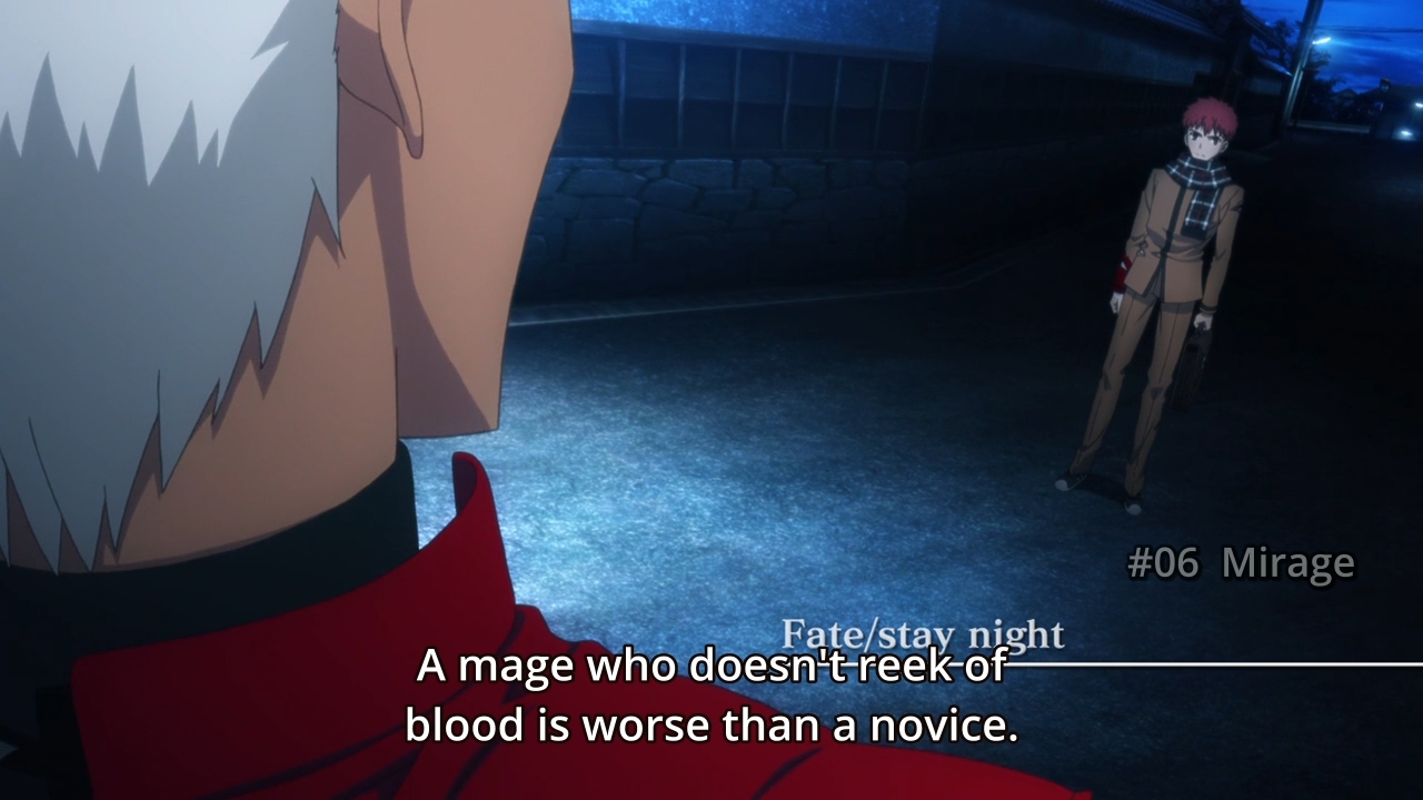 I want to briefly remind you, E Minor, that Archer is about to face off against Caster, a mage servant who has not only been *gaining strength* by stealing people’s life forces, but is clearly very cunning and able to erect barriers like crazy. The VN explained that mage-type servants also have magical abilities that trump even the strongest magi.