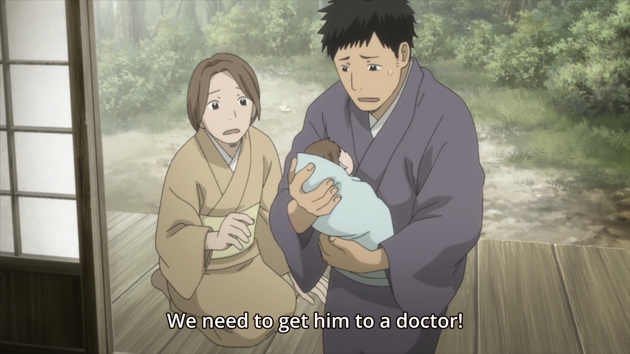 You get the feeling that the father is a no-nonsense kind of guy. He wants to be as practical and pragmatic as possible. And hey, life was hard back then. You don’t get the luxury to have flights of fancy. His wife, on the other hand, represents the other end of the spectrum. Ever since she gave birth to Gen, she could “see things.” Maybe this was just a sign of our new mother’s newfound appreciation for life. Nevertheless, this new talent of hers disturbed her husband. I wonder if he and others around her attributed her condition to some form of female hysteria. Female hysteria is, of course, no longer considered a medical disorder, but we have to keep in mind what time setting we’re in. During Ginko’s time, it wouldn’t surprise me if this false affliction was considered a very real and serious threat. The father thus took it upon himself to raise Gen by himself, which must’ve been a very difficult. I’m sure the father still had to work long hours, so how much time did he really spend with Gen? How much attention did he really pay to Gen’s physical and emotional upbringing? Being the no-nonsense kind of guy that he is, the father probably saw to it that Gen was well-fed and physically healthy. And of course, he likely tried to instill the same no-nonsense practicality into his own son, especially when Gen started to “see things” like his “crazy mother.” But I doubt the father showed him much sensitivity.
