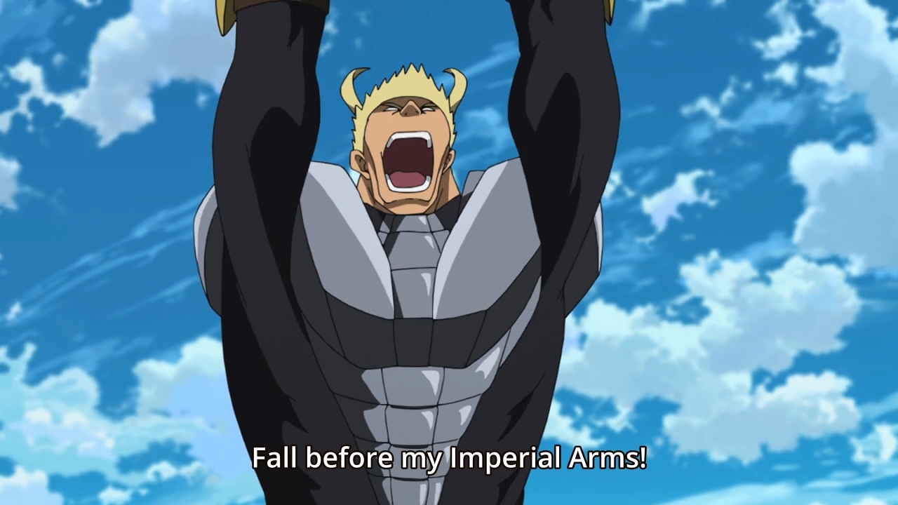 — And for the billionth time in this series, Mine explains to us and her opponents that her Imperial Arms gets stronger whenever she’s in a pinch. Good thing, too, ’cause I had totally forgotten! And I’m sure her enemies would love to know her strength and weakness. That’s just being a proper lady.