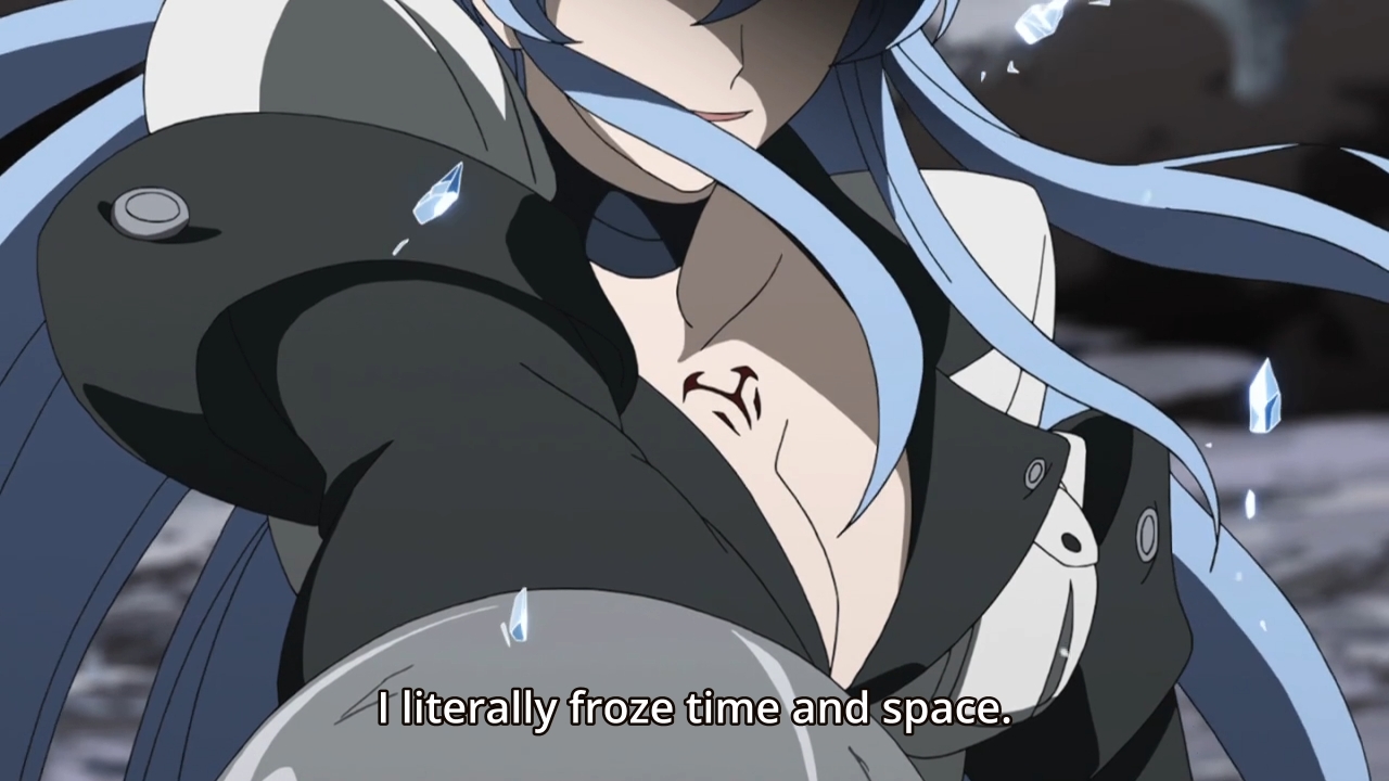 — About to lose her boytoy, Esdeath finally pulls out her ridiculously overpowered trump card: she can literally freeze time and space. LITERALLY. FREEZE. TIME. AND. SPACE. Oh sure, she can’t do it over and over… but she can freeze time and space, man!