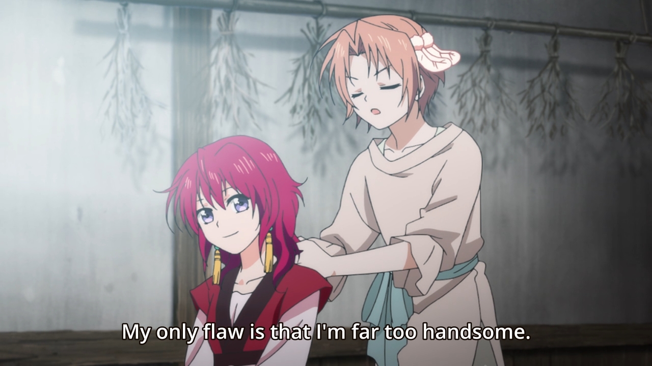 — Yun gives Yona a new set of clothes. As you might already have noticed from the OP, it looks like she’ll be wearing this outfit for the majority of the remaining story. He claims he just had extra cloth lying around… that he conveniently dyed red to match Yona’s hair. Yun then gives Yona’s hair a trim, but also complains about having to do it. Then, uh, don’t do it. People like that are annoying. But he’s probably just going to be another tsundere character, which is really lame.