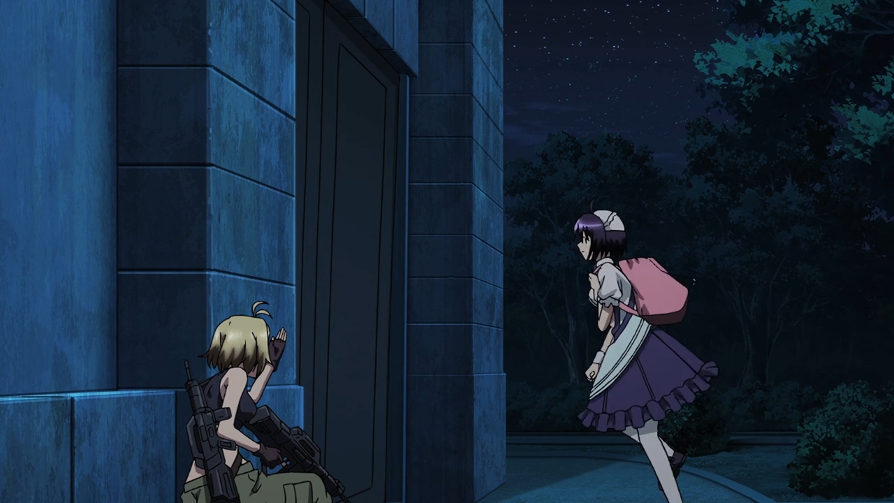 — Elsewhere, we see Ange and Momoka sneaking around at the dead of night. Even so, the maid is still wearing her stuffy maid outfit. This is what anime does all the time, though. It’s not a “Momoka is dumb” thing. It’s not even a “Cross Ange is dumb” thing. In almost every anime that I’ve ever seen, the help must always look the part regardless of the situation. It’s odd, no? Why is that? We already know she’s a maid. Why is it necessary to keep reminding us that she’s a maid?