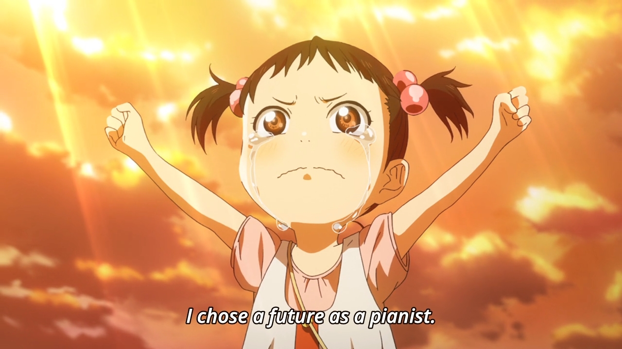 — Kousei’s performance not only made Emi want to become a pianist, it also moved her to tears. Wait, wait, it also compelled her to climb to the top of a jungle gym and announce to the entire neighborhood that she’ll become a pianist.