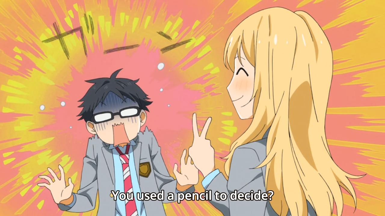 — Kousei: “I never knew. That music could be this colorful, and that it even had a scent.” If you’re smelling things out of nowhere, you might have a tumor. Just erring on the safe side, buddy! Go get that checked out!