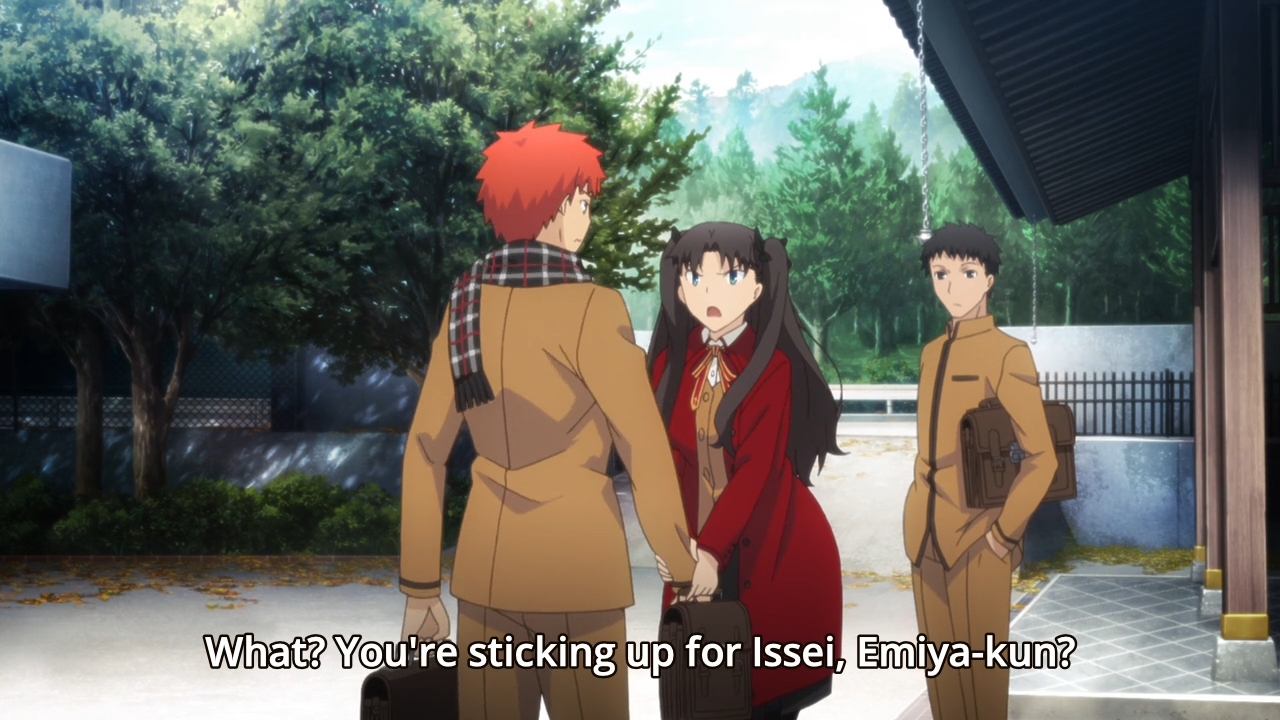 — All of a sudden, Rin “hypothetically” asks Shirou how a girl would feel if she was given away for adoption. I guess we can pencil Rin and Sakura down as related… I mean, the adaptation can’t spell it out any harder than that. Nevertheless, Shirou takes her question at face value, and answers it in a rather boring way. Durr, if the family is good, then she wouldn’t have any complaints! Someone said that this guy would become more interesting as the story developed, but eh…