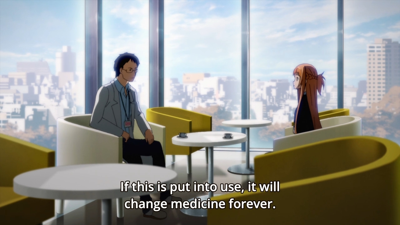— Awwwww yeeeeeeeah, exposition about the Medicube-thingamajig! That’s what I watch Sword Art Online for! Exposition about made-up technology!