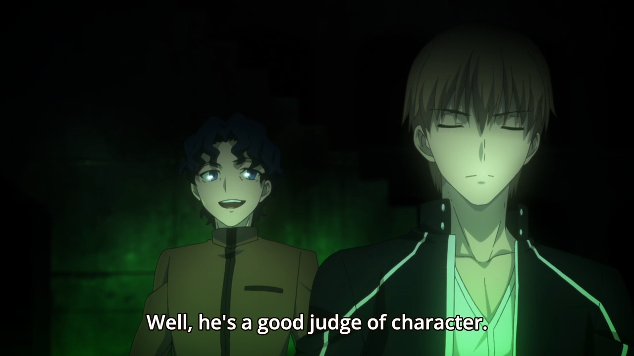 — So later that night, he and Rin wait for Kuzuki to come down the road. When the man does so, Rin fires off a spell in the teacher’s direction, and as a result, they discover his true identity as Caster’s master. Nevertheless, Shirou has no plans to go in with guns blazing. Instead, he wants to discern Kuzuki’s culpability. Look at his face, though, when he hears that this is the first time Kuzuki has heard of his Servant’s misdeeds. Ah, to be that idealistic. I mean, his face just says so much, doesn’t it? It literally makes Shirou’s day to hear that his teacher might not be a bad person. Not only that, he instantly believes Kuzuki’s words. Like, he doesn’t even pause to consider that maybe Kuzuki is lying.