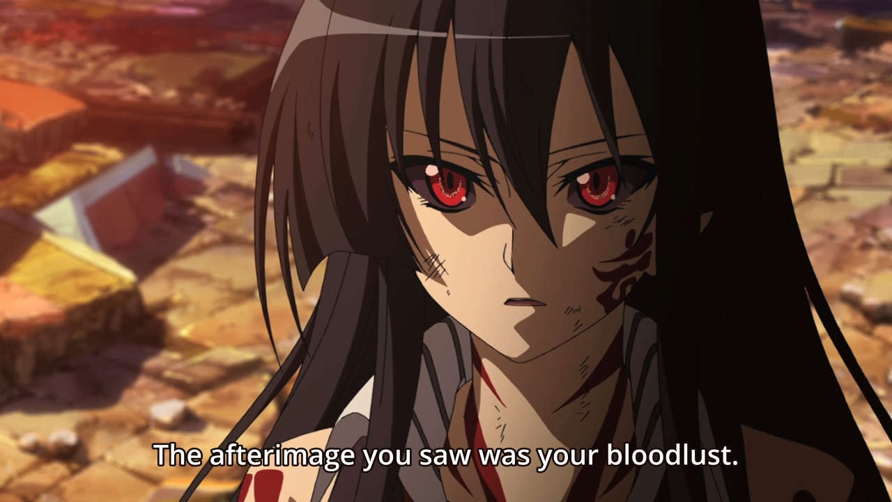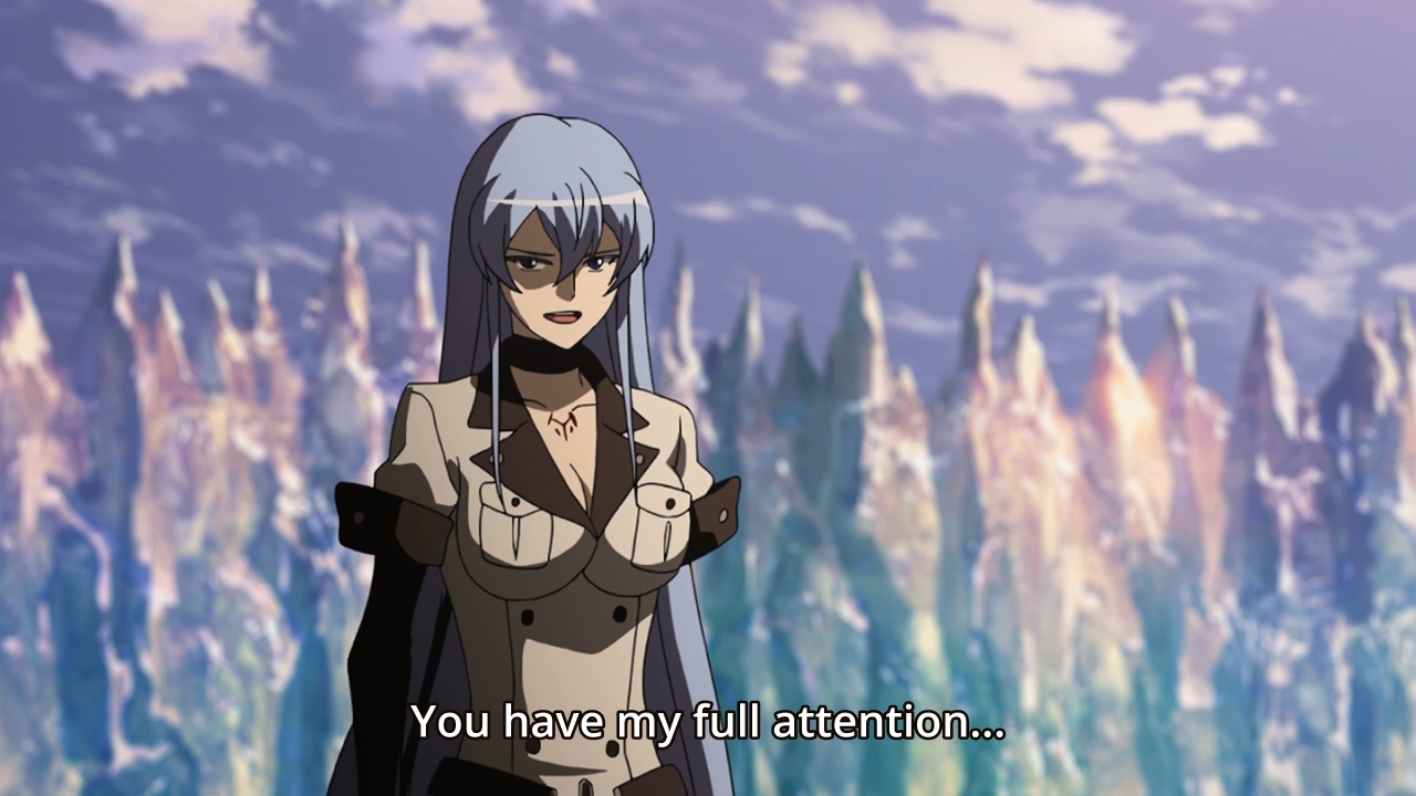 — Well, Esdeath should’ve destroyed Akame when she had the chance. It’s too late now. Akame cuts herself with her own sword, which… uh, makes her demonic or something? So now she’s faster and stronger out of nowhere. There’s no real drama here. We’re just watching one power level bar attempting to overtake the other one.