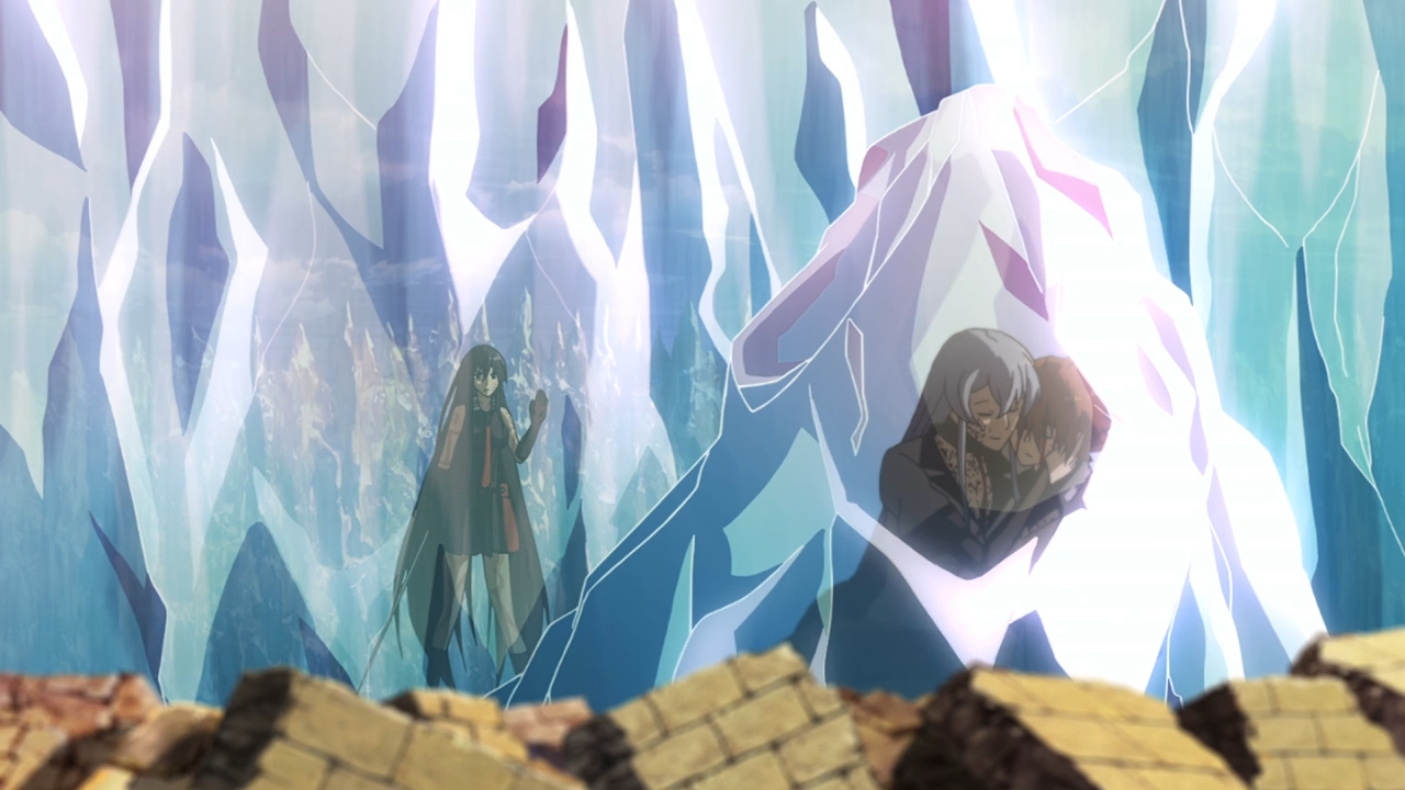Akame was slicing the ice all over the place, but she is magically unable to cut through the ice wall barrier and rescue Tatsumi’s corpse. Jesus, the very least he needs is a decent burial to commemorate his sacrifice– not to be shattered into a million pieces by the enemy in a bizarre show of “love”.