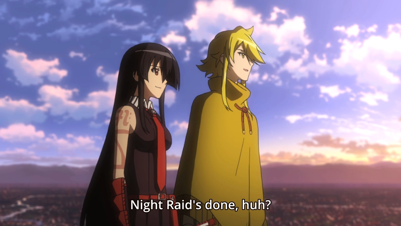 — Afterwards, we see the two remaining heroines — I don’t count Najenda — standing side by side on some cliff. Leone then bids Akame farewell, so I guess she allowed herself to live long enough to say her goodbyes. And now, like a poor cat, she goes off to die alone in some alleyway. But, uh, is Akame’s going to survive cutting herself with her own sword? I guess so.