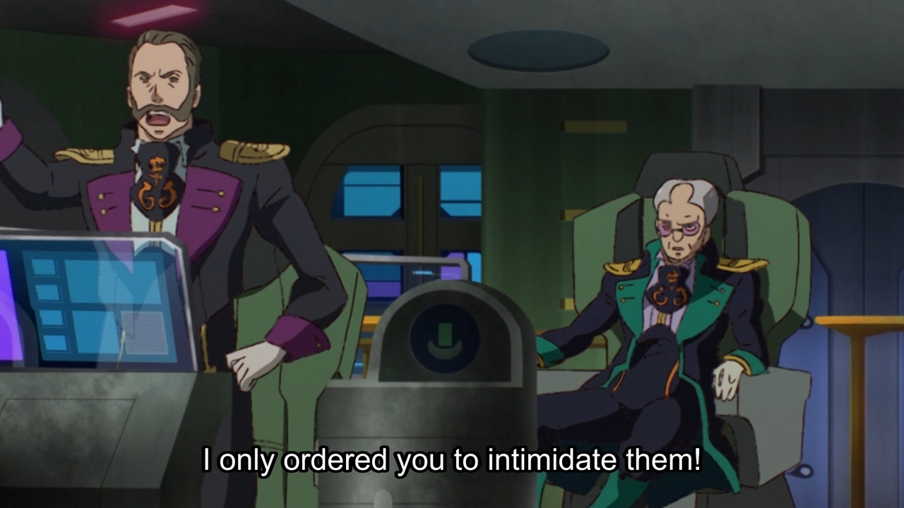 ‘Cause that’s where we’re going next. Anyway, Reconguista in G always seem to do just enough to get you excited for the next episode. But when the actual episode actually rolls around, it never quite delivers. I mean, I thought we’d get an explosive battle this week. With everyone teaming up to face the threat from space, I thought we’d at least see some sort of fighting break out. But alas, it is not to be. Hell, half of the episode is spent on just getting everyone in one place! And then… nothing really happens.Well, that’s not quite fair. Klim cooks up this harebrained scheme where a bunch of mobile suits — led by him, of course — will pretend to fly up to the moon fleet with a white flag. This way, when the opportunity presents itself, the hastily cobbled together alliance of Earthnoids — yeah, that’s what they’re calling themselves — can quickly attack and destroy “the big guy in the middle of the fleet.” Klim honestly thinks that the people on the moon are “unaccustomed to war,” so this will cause the moon fleet to completely scatter. Well, the moon people are smarter than he thinks. Or maybe Klim is just dumber than he thinks. After all, Mask pretty much calls our genius an idiot right off the bat. But you know how it goes. Everyone’s in danger, so Bellri ends up being the savior again. Though to be fair, even the moon people are incompetent in their own ways.