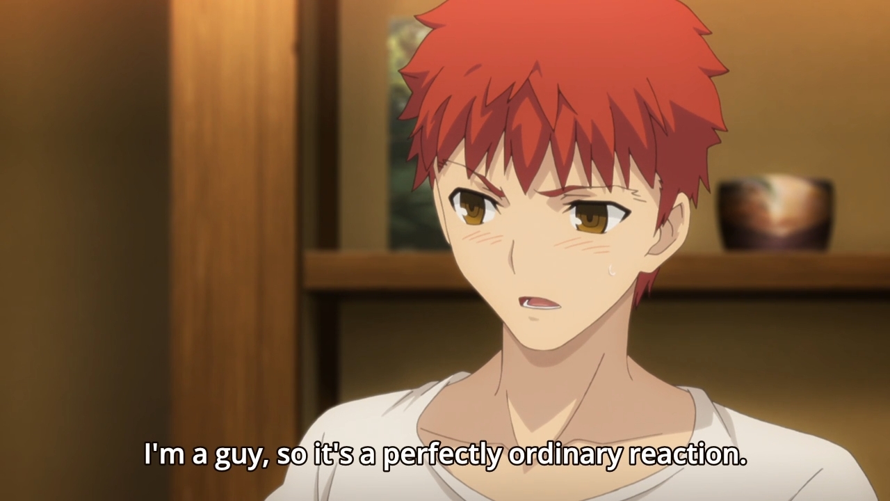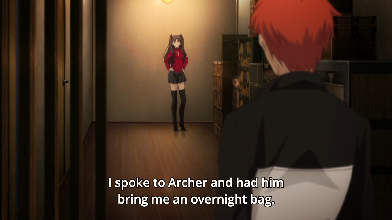 — I like how Shirou expresses shock at Tohsaka wearing a skirt. Oh man, a skirt and thighhighs? Be still, my heart!