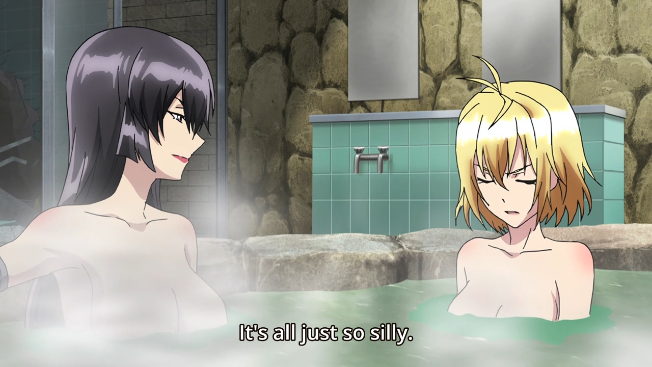 …and for some reason, we have to get naked. Yeah, I’m with Ange on this one. Still, that’s not the biggest problem on our hands. Y’see, if Jill’s going to explain everything to Ange, that means I’ll have to brace myself for the impending infodump. And an impending infodump implies that a lot of exposition is headed my way. Sure, I’d love to know what Cross Ange is all about. I’m just dying to hear Jill’s explanation. But exposition is boring, man. And this is probably why these two characters are even naked in the first place. Because exposition is so boring, we may as well have them be naked.