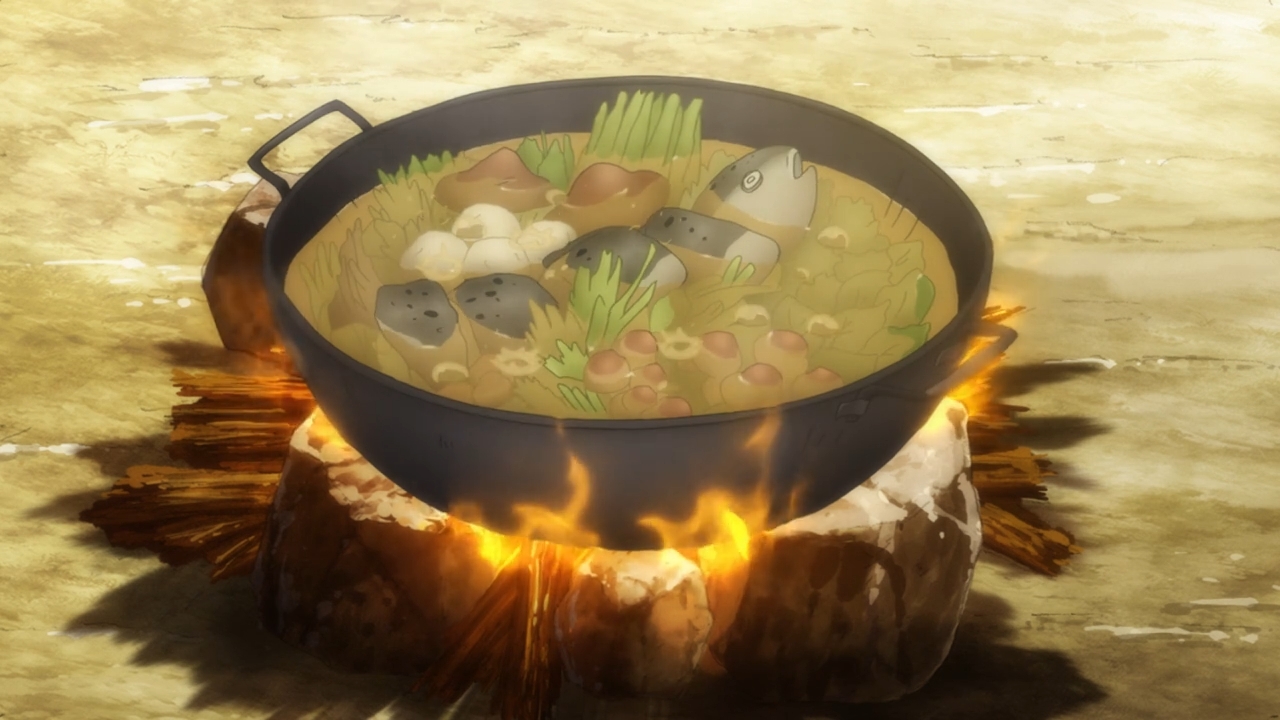 — I guess we’re back to fancy food. It ain’t foie gras and escargot, but it’s fancy enough for a bunch of travelers from so long ago. It’s a miso hot pot, too. If you’re wondering where the miso and giant wok-like pot came from, our boy genius just conveniently traded for them at the village without his friends knowing anything about it.