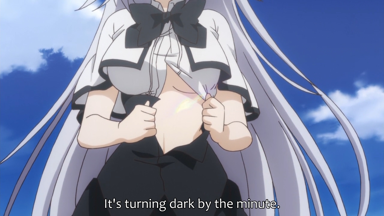 Here, you see Iris showing Yuu her mark. Apparently, the girl doesn’t wear a bra. She had also intended to kill herself, but she chickened out at the last minute. Still, she’s afraid to turn into a dragon and kill all of her friends. Yeah, I hate it too when that happens.