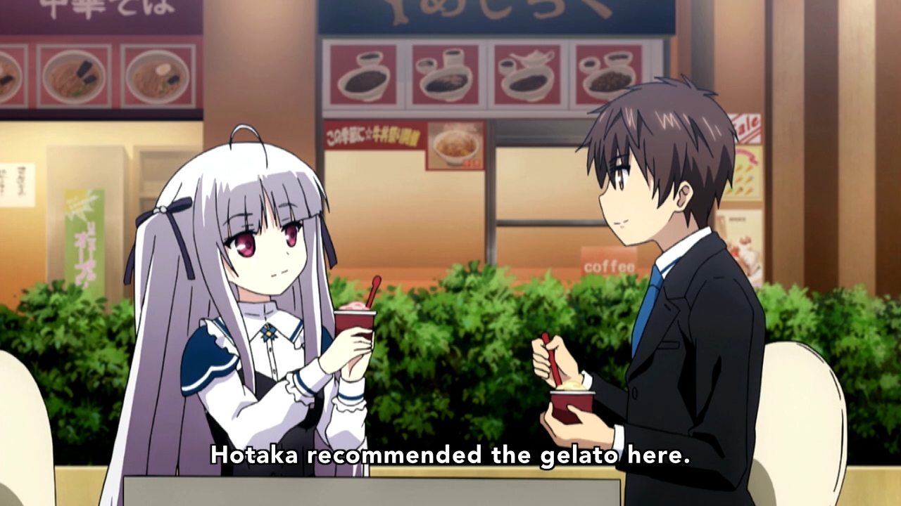 Later, they sit down to enjoy some sweets. I was initially surprised to see that they weren’t eating crepes, which is all the rage in most harem series. But of course, we’ve got a Euro fetish going here, so it’s gelato.