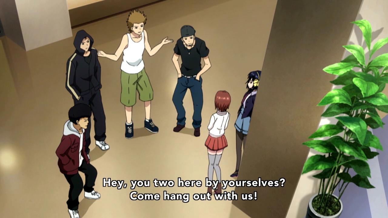 The next day, Thor takes his pale princess to go shopping for clothes. Exciting anime. Julie might be all European and everything, but she’s literally too dumb to walk through a mall without being carried away by little children. So of course, the harem lead needs to hold her hand like she has special needs.