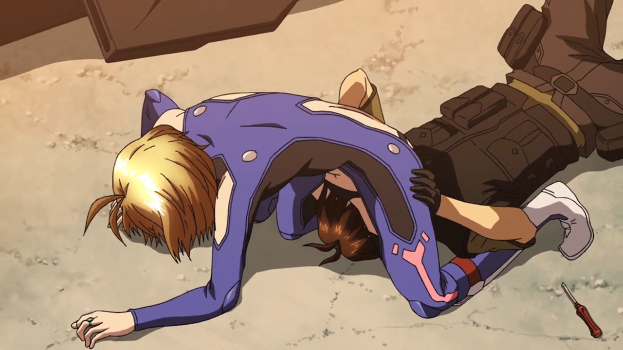 — For that, Ange beats him bad enough that he can’t use his hands? But later, we see him piloting his… whatever it is just fine, so the injuries must not have been serious. Still, it’s the same pathetic pattern that you see all the time in anime. Guy gets a free pass to do something lecherous, and the girl gets a free pass to beat the shit out of him. Sounds awesome. Keep it up. Never change. Never grow up.