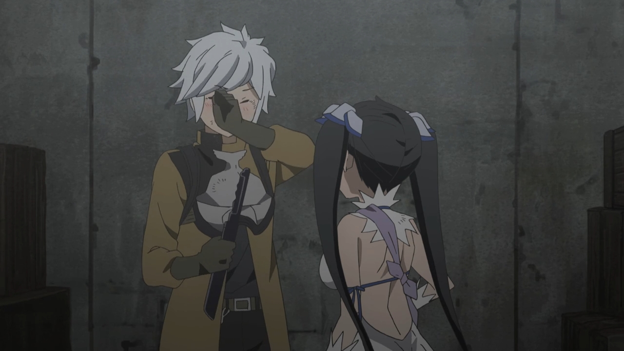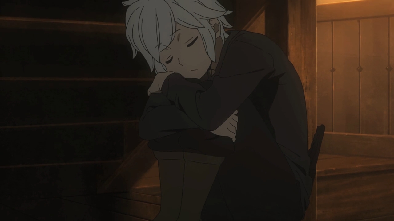 Near the end of the episode, Hestia collapses even though Bellri manages to defeat the big, bad gorilla. Maybe the excitement got to her. Maybe she’s just exhausted. Still, the concerned Bellri huddles up beneath a staircase with his knees to his chest.