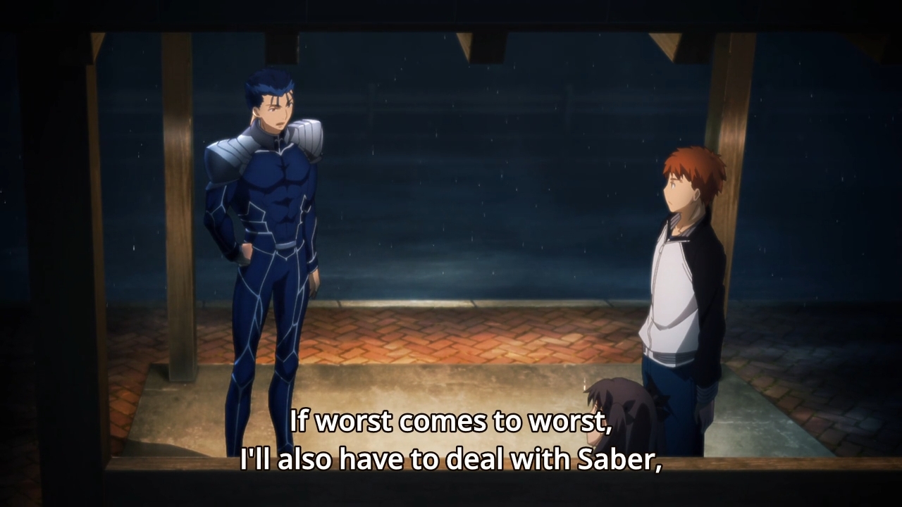 Then our heroes and Lancer talk about stuff. Gotta discuss what’s about to happen. Gotta make sure we know what our plan is. These are very deep plans, such as… Lancer might have to fight three people. And can Rin and Shirou really overcome Caster? STAY TUNED