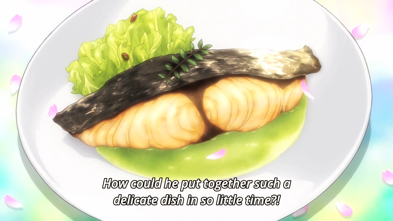 But of course, Soma’s dish tastes super good. In fact, it’s got amazing mouthfeel. Ah, a foodie buzzword I didn’t expect to see in this anime. It just sounds so off-putting. Mouthfeel. Ugh. There’s gotta be a better way to describe it. Anyway, Soma’s mackerel basically has a really crispy skin.