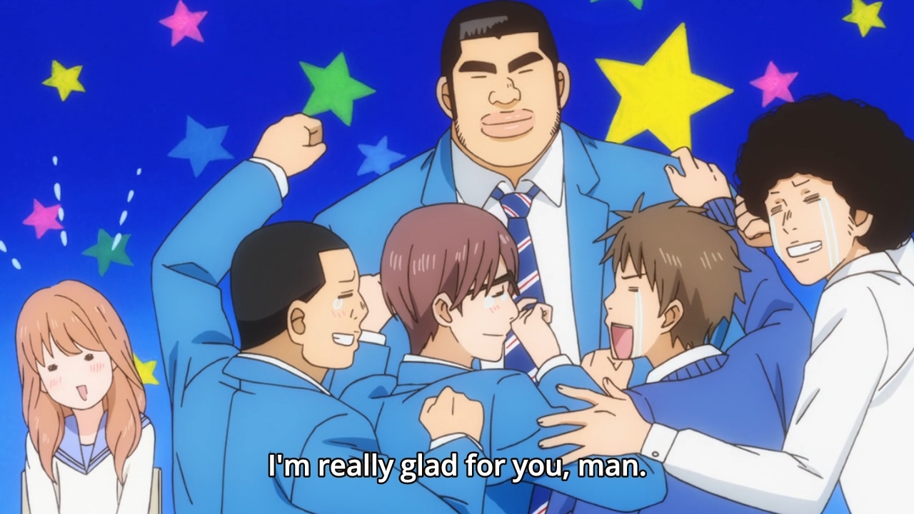 First off, Takeo isn’t annoying. In fact, none of the main characters are annoying, and that’s good. That was the main problem with Isshuukan Friends. The more I watched the show, the more I just grew to dislike Yuki. Fine, not everyone’s perfect, but characters typically grow and mature over the course of a series. There are exceptions to this rule, but in a story like Isshuukan Friends, it’s just jarring when a character arc actually goes the opposite way. By the end of the story, I couldn’t take Yuki’s whiny, dramatic antics anymore so I had to turn off the anime. But to bring this back to Ore Monogatari, Takeo’s a solid dude. Of course, we’re only five episodes into this story, so there’s plenty of time for him to shit the bed. For now, however, Takeo doesn’t piss me off. And like I’ve said, none of the main characters really do. These stories typically have a bored, disinterested-looking best friend, but Makoto doesn’t go too far with it. Basically, he doesn’t become a sarcastic jerk just to counteract Takeo’s earnestness.