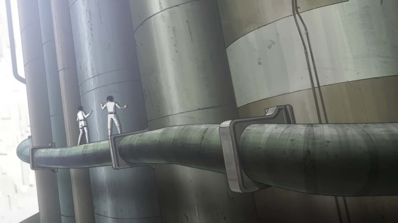 — And when Ochiai took over the entire Kunato family, I thought he would do some sinister shit. Maybe that will come later, but everything is just so boring and unthreatening nowadays. For instance, Nagate bumps into the brainwashed sister in a tunnel, and she just giggles as she talks about Tsumugi’s recovery.