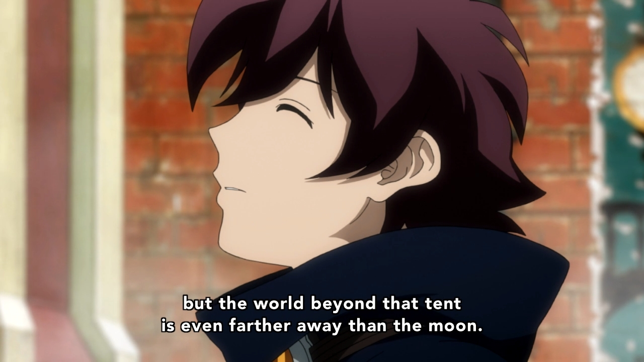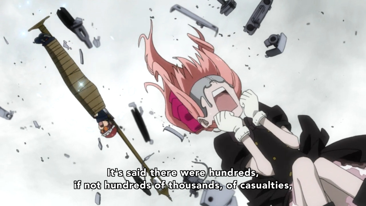 I’d be lying if I said that Kekkai Sensen doesn’t have its moments. That’s why this post is mostly about episode six, after all. I find the weird, little mushroom’s story and his friendship with Leo to be rather touching. Y’know, as short as it was. When stressed, our mushroom friend releases a cloud of pink spores. Said cloud will also knock you out and erase your memories. How much does it erase? Well, that’s the tricky part. Leo ends up forgetting the events in the past two weeks of his life, but that can’t be the extent of it. After all, our mushroom friend’s own mother supposedly doesn’t even remember giving birth to him. Did she perhaps get a larger dose of those spores? And who’s to say she didn’t have that same power herself? Maybe it wasn’t the mushroom friend who got stressed one day and caused him and his own mother to forget each other. But there’s perhaps one more melancholic thought to consider: Leo still felt a sense of deja vu when he ran across his mushroom friend again. You would think the bonds between a mother and her child would be stronger than what Leo and the mushroom friend shared… but who knows? So the episode is touching in that regard.