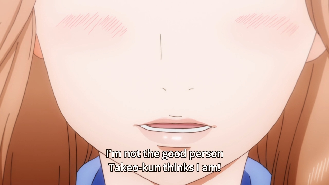 — Again, the story could’ve taken a much more serious route without being overly dramatic. What might she have lied about? Oh, I don’t know. Maybe she used to think badly of Takeo too or something. Or maybe she’s lied about her identity in some way. Y’know, real issues that people would actually hide from their lovers at the start of a relationship. Not more of this softball bullshit.