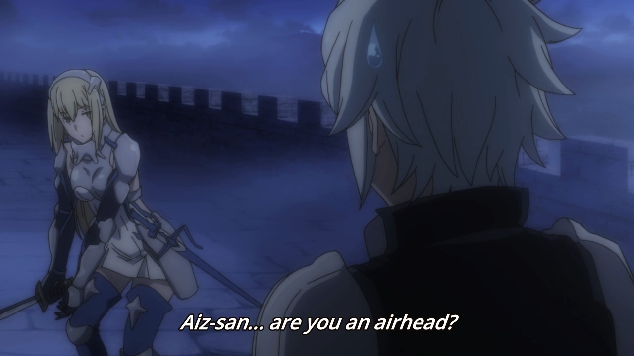 — Anyway, Eyes returns Bellri’s ugly armguard back to him. This also gives them an opportunity to talk, which results in the girl offering to give our hero some free combat training. Seriously, though? That’s her armor? She only needs to protect half of her right breast? When I had seen her wear the same armor in a previous episode, I thought maybe a strong dungeon mob and broken off half of it in an intense fight (yeah, right). Jokes on me, I guess.