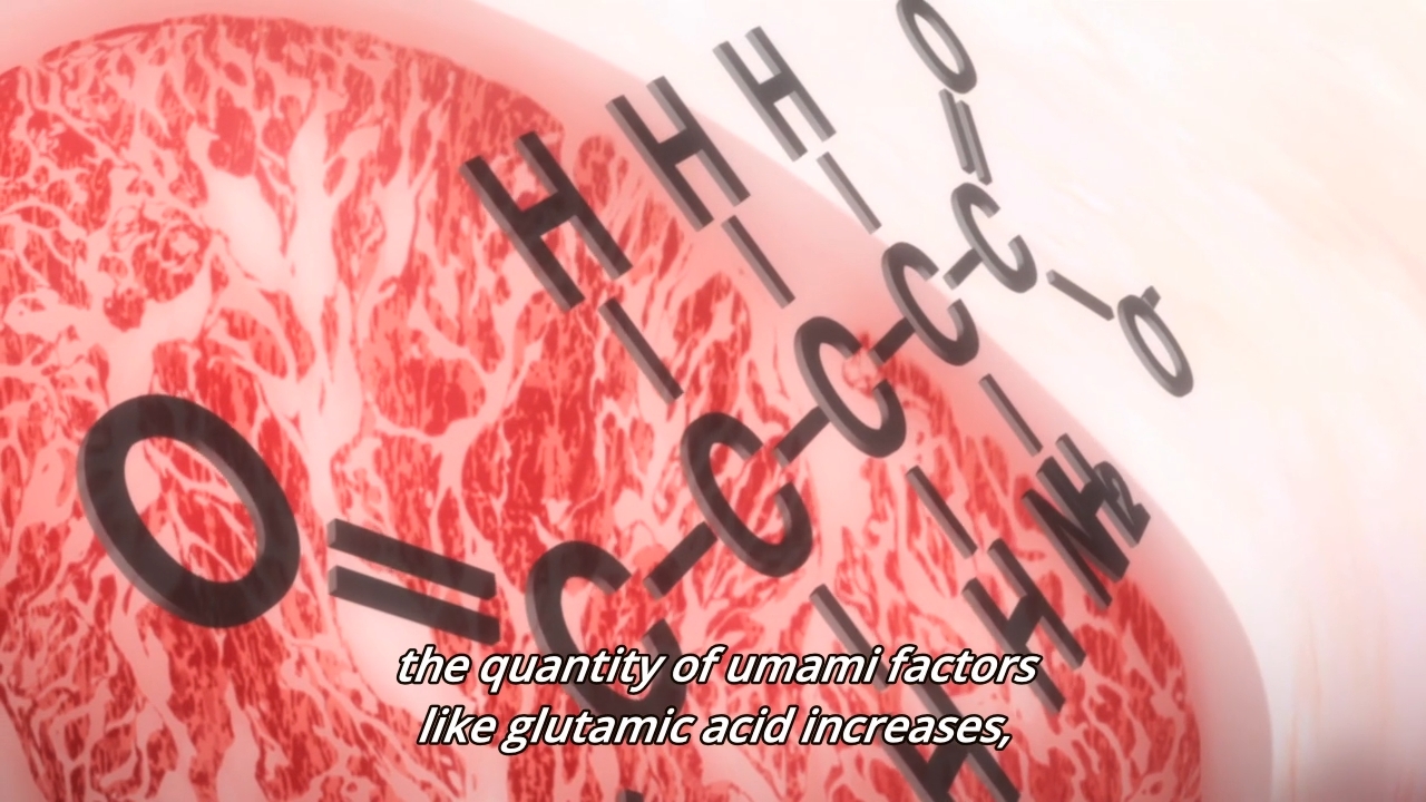 — She then sniffs the aged beef and revels in its slightly sweet smell. I assume the beef is dry aged. What’s the purpose of dry-aging the beef? It’s kind of like with cheese, really. Yeah, yeah, enzymatic action will tenderize the beef, and dry-aging will improve the meat’s texture. But it’s really all about oxidizing the fat, which will allow the beef to take on some interesting flavors. Would I call it sweet smelling? Well, maybe. It depends on how long this cut of meat was aged. I don’t remember if the show ever specified that. But obviously, the longer you dry-age the meat, the funkier it will smell, and… that’s not necessarily a bad thing. It’s like how some people love funky cheeses and some people don’t. Dry-aging the beef isn’t a guarantee that it’ll taste better, but most people will agree that at least two weeks is the key. That’s because the texture will improve dramatically, I suspect. After two weeks, though, it’s really a toss-up. I’ve had some cuts that were aged for over 40 days… I wouldn’t say that it was my favorite.