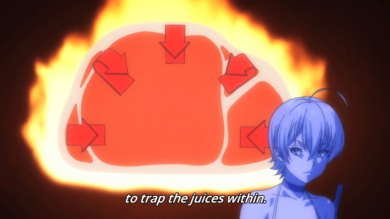 — Anyway, not that it matters to this anime or its target audience, but you actually get kicked out of a kitchen for simply not wearing proper shoes. C’mon, it’s a high pressure job with a ton of time constraints. Lots of time, you have to be running in the kitchen without actually running. The last thing that the head chef needs from you is inappropriate shoes. So needless to say, Meat Master is already failing in that department, but again, we’re not here for actual food facts.