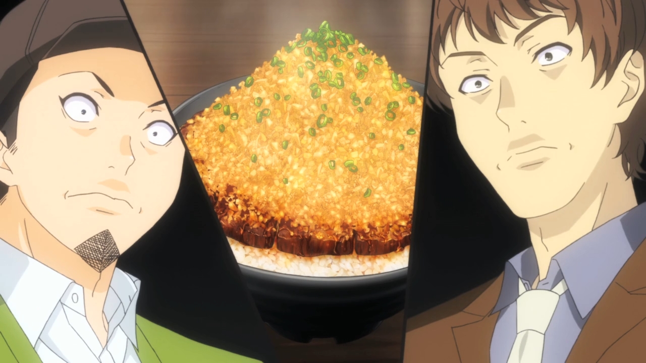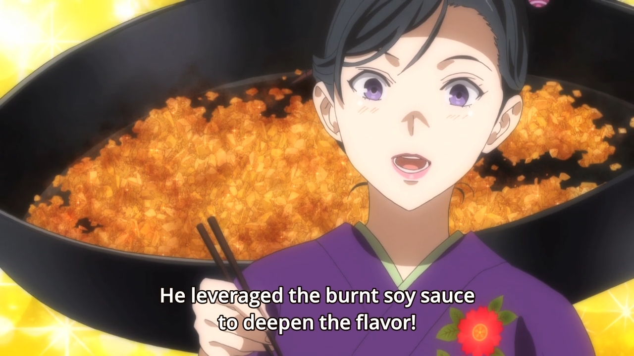 — Apparently, the thing that really put Soma over the top was the pickled plum paste that he mixed into the rice. I imagine the slight acidity really helps when you’re eating mountains of rich beef and onions. It also reminds me of how you want to season with vinegar. There are two common mistakes that people make in cooking. First, they don’t know how to use salt properly. Second, they don’t use enough acids. People are always surprised when they hear that, for example, a stew or soup just needs a good amount of vinegar. Ugh, vinegar! Won’t that make everything taste vinegary? Nah. Like salt, the proper amount does the trick. If you use the right amount of salt, the dish shouldn’t taste salty. It should just taste right. Likewise, a small amount of vinegar really enhances sauces. Well, Soma didn’t use vinegar here, but the pickled plum likely adds as a good counterbalance to all of the other flavors. Just more food facts…