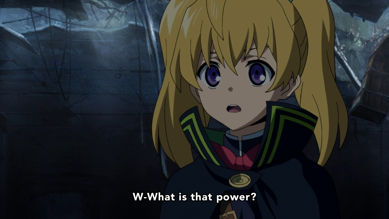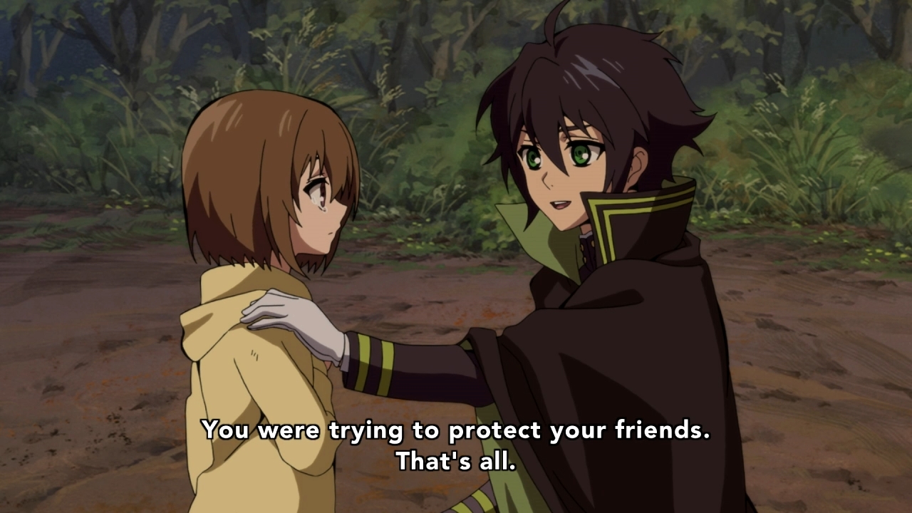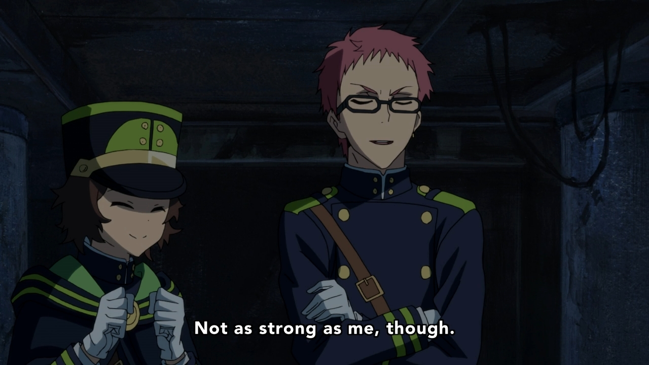 — Shinoa decides that now is a good time to tell Mitsuba all about our hero’s childhood. And we try to play it up like this big tragedy. Like Yuichiro had a dark past because he abandon his family! But we all watched that first episode. We all saw how they all pretty much died before he could even leave. So why is the anime fronting?