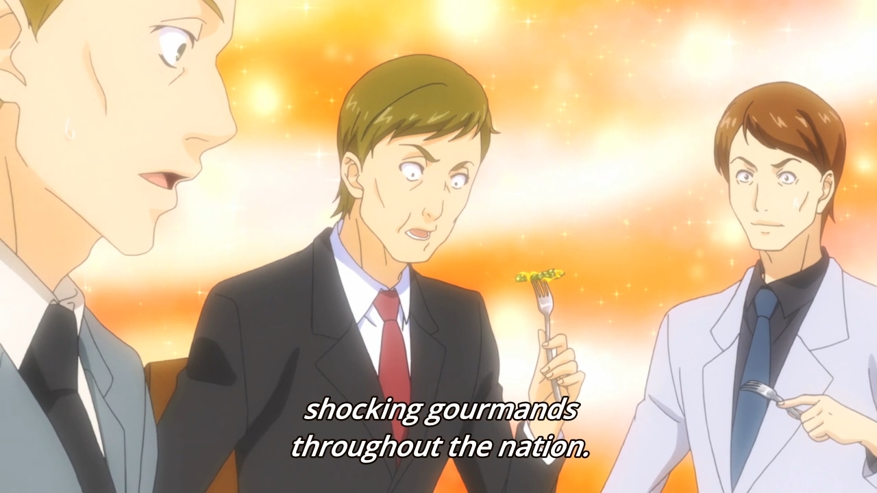 — Dojima warns Soma not to influence Megumi’s recipe. After all, he’s supposedly a sous chef and nothing more… as if that means something. I’m pretty sure most respectable head chefs respect their sous chefs enough to collaborate with them, but sure, in this universe, the sous chef is nothing more than a glorified line cook.