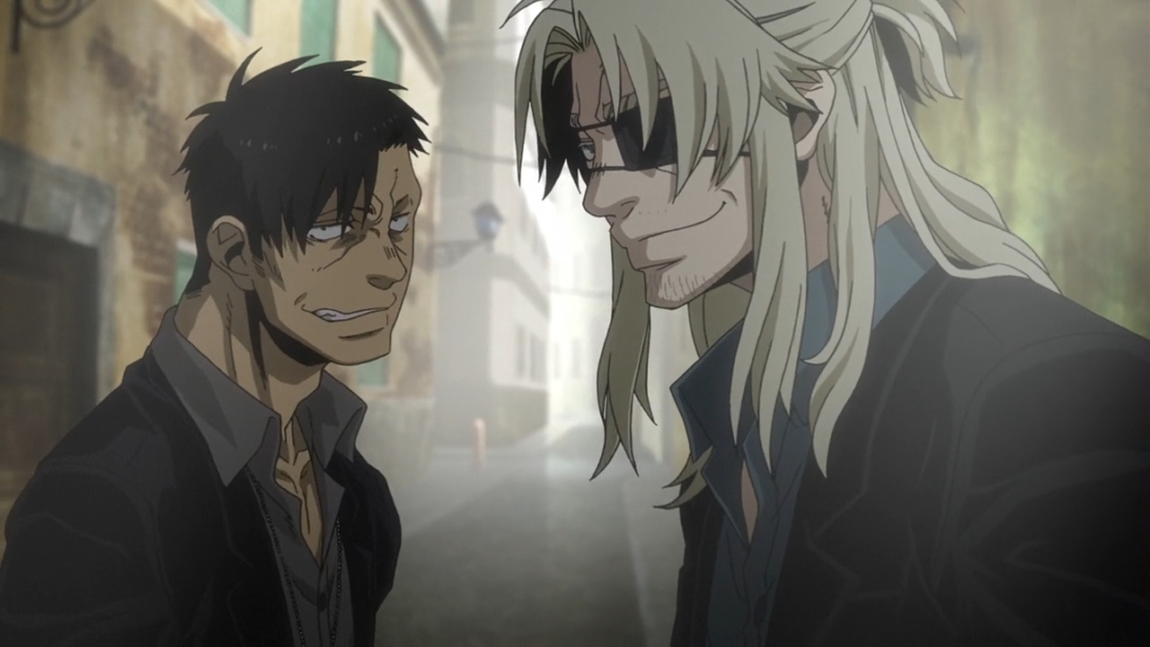 What’s this? A show that doesn’t take place in Japan? And the main characters aren’t high school kids? Finally, we are far removed from the world of battling schoolchildren and state-of-the-art schools. We are far removed from magical schoolgirls and colossal robots. And amazingly, some young, unassuming shounen doesn’t just stumble his way into an amazing power that makes him the most pivotal character in the story. Don’t get me wrong, though. Kekkai Sensen was the least bad show last season, and I certainly enjoyed most of it. But the truth is that a show like Kekkai Sensen still couldn’t help but have plenty of anime notes — the same anime notes that sometimes made the anime feel too conventional and cookie-cutter. Luckily, Gangsta avoids a lot of those same notes that I often deride. So… I should like it, right? Well, I suppose it’s a breath of fresh air… if fresh air can be thugs with hearts of gold, and women being mistreated left and right. But don’t worry! Our thugs — the good ones — eventually take in Alex, the dark-haired, dark-skinned beauty with “monster tits.” Nice.