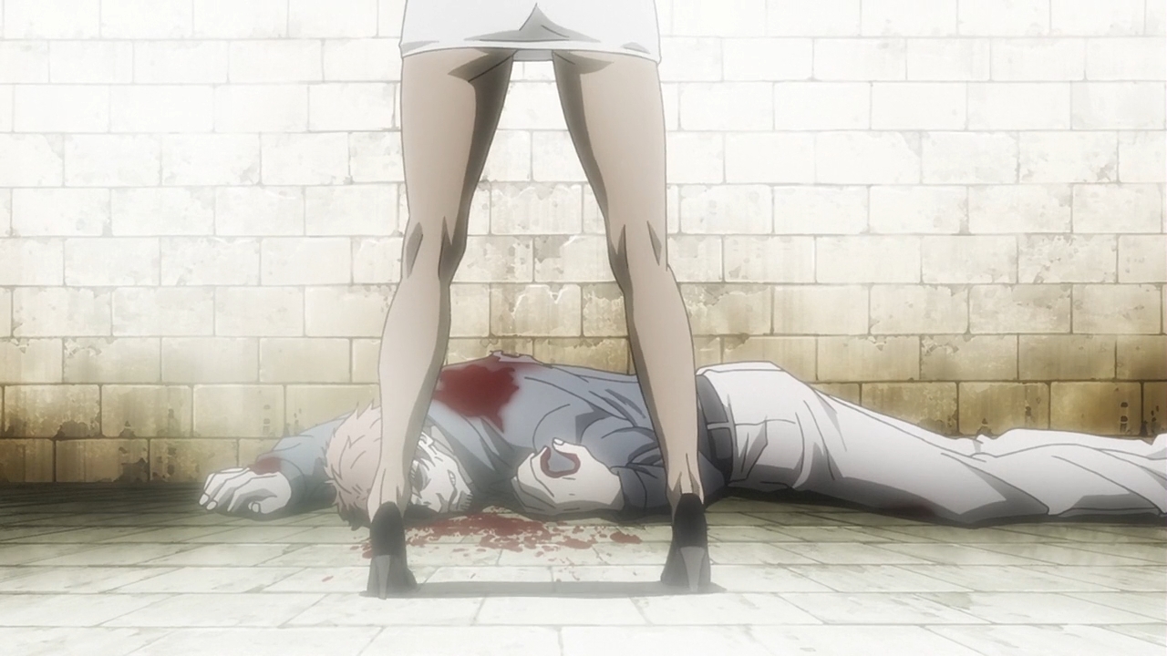 I suppose Alex is very fortunate that the thugs with hearts of gold give her a handkerchief. Then after giving her a handkerchief, they even give her a job. Answer them phones for us! You don’t have to turn tricks anymore! You have a home now! You no longer have to be on the streets! But what about the rest? What about those drugged up girls in Barry’s apartment? Do they just turn to the other gangs or what? Corsica? Monroe? I don’t even know. I can’t know. And maybe that’s just because this is just an introductory episode. I can give Gangsta the benefit of the doubt, and just assume that it hasn’t had the time to reflect on the very problems it raises. Sure, I can do that. But until then, Gangsta feels a little empty to me. A little light in the head. Because the focus in the early goings are the two Handymen and how they are such cool, badass dudes. Badass enough that a katana is enough to defeat a slew of armed men in an alley. Those men were armed with guns, by the way. But maybe Nicholas is just that strong and quick that you can’t shoot him. After all, he can apparently kick hard enough to nearly flip a police car over.