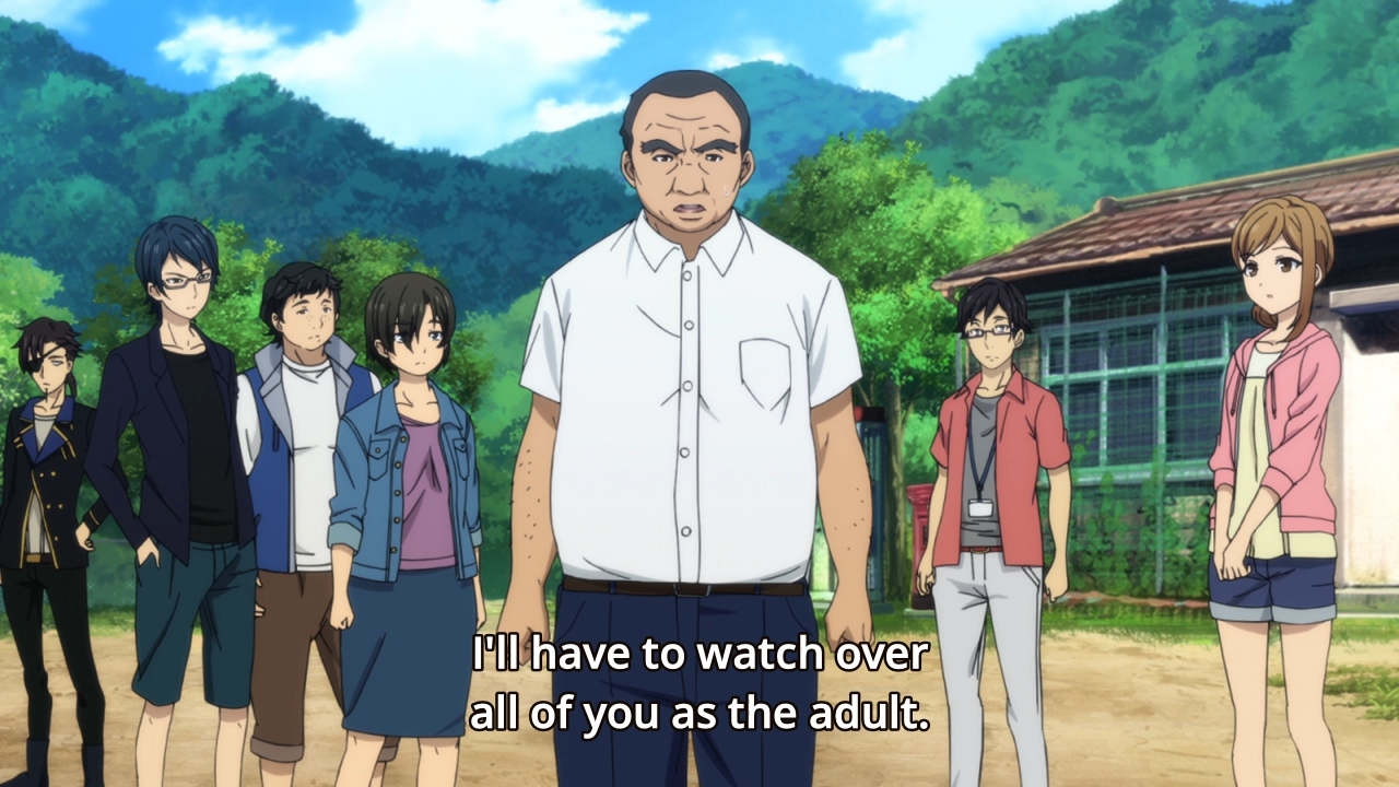Eventually, most people reconvene at the center of the village only to be greeted by the bus driver again. He had originally decided to part ways with everyone when a landslide forced the bus off road. So why is he here? He’s here ’cause he met someone. Naturally, we don’t know who he met, but that someone must’ve convinced him to follow the kids. But the kids are arrogant and dismissive. Rather than question the bus driver’s sudden change-of-heart, they just act like pissants: “If you get off your soapbox, we can consider letting you join us, I guess.” Then they all take turns questioning Koharun. How did she even know to find this place? The lady then admits that she had received a mysterious email. But of course, the mysterious email’s sender can’t be tracked, and oh yeah, she didn’t bring her laptop. Guys, guys, when you ditch society, you also have to ditch the internet. The episode ends on a cliffhanger when another group finally reunites with everyone, and frantically announces that Pukey and Sir Raps-a-Lot have gone missing. See, I’m not worried about Pukey, ’cause I’m sure she’s got plot armor. On the other hand, I feel Sir Raps-aLot’s days are numbered.