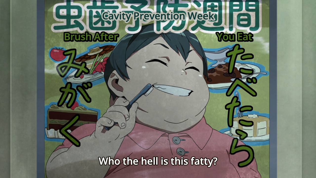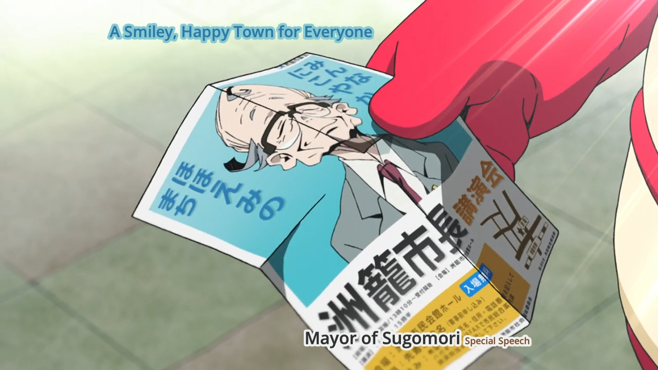 How do we achieve a “smiley, happy town for everyone?” You almost have to be suspicious when the state poses such a question, huh? The expectation is almost always followed by what individuals can do, and hardly what the state can do better. You see hints of the larger problem at the start to the first episode. We see shots after shots of Sugumori City’s high-rise apartments. These shots are not random. They are visions of an isolated and atomized society; they are echos of the social alienation that is the byproduct of Japan’s massive urbanization. The apartments illustrate individuals can live so closely together, and yet there exists a high degree of social isolation between individuals. It’s a well-known fact that Katsuhira’s parents are away on business trips. They are likely proud that their hard work allows Katsuhira to live in such a nice home and go to such a nice school, but nevertheless, when’s the last time he talked to either of them? Furthermore, he and Chidori live next door to each other, but there’s still a substantial gap between them, both spatially and on an interpersonal level. She admits that she no longer understands him; she hesitates when he asks if they should speak in person even though they have known each other for so long. Hajime humorously tries to bridge this gap, but ends up failing and falling several stories. Yoshiharu also lives in one of these high rise apartments. His mailbox is jam-packed with mail, which suggests quite a bit. For instance, the mailperson has to have noticed the mess, but chose to do nothing about it. It reveals the degree to which we can see the problem and yet continue to ignore it. The outside of Yoshiharu’s apartment is littered with junk, but it’s doubtful if his neighbors even care. Again, we live closely together, but there is no community.