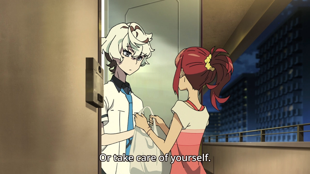 Later on, Katsuhira shows that he’s still got a pulse when he invites Noriko to “connect” with the rest of them. Oh look, another phone to stare at. I feel a pulse coursing through me right now. Again, this would all be great if the characters were killer, but our hero is just too flat and dull to make any of this interesting. Later that night, Chidori drops off some bentos at Katsuhira’s place. Unintentionally or not, she shows that she clearly still has feelings for him — you’d have to be a Katsuhira yourself not to notice — but she simply cannot penetrate Katsuhira’s leaden personality. He’s only got enough energy to be inquisitive about Noriko and only Noriko, so this act of tender, loving care on Chidori’s part nearly goes to waste. Thanks to Hajime’s voracious appetite, however, the girl manages to improve a bit in his eyes. Well, she did make a bento for him after all. Presumably, anyway. Maybe she intended to make two just for Katsuhira, but that’s doubtful. As they say, the fastest way to a guy’s heart is through his stomach. Our placid hero notes that the girl has always been “that way.” He’s sharp enough to notice this about Chidori, but not sharp enough to notice how much frustration he’s putting his longest, closest friend through. Hah, well, whatever’s convenient for the narrative, right guys? Finally, everyone climbs aboard a spacious vehicle, and Noriko proceeds to drop some expository bombs from way up high. I’m sweating bullets over here. Geez, let me catch my breath, Trigger.