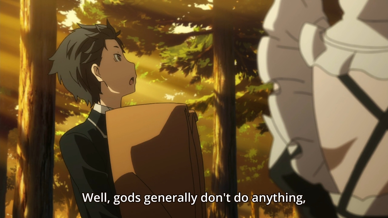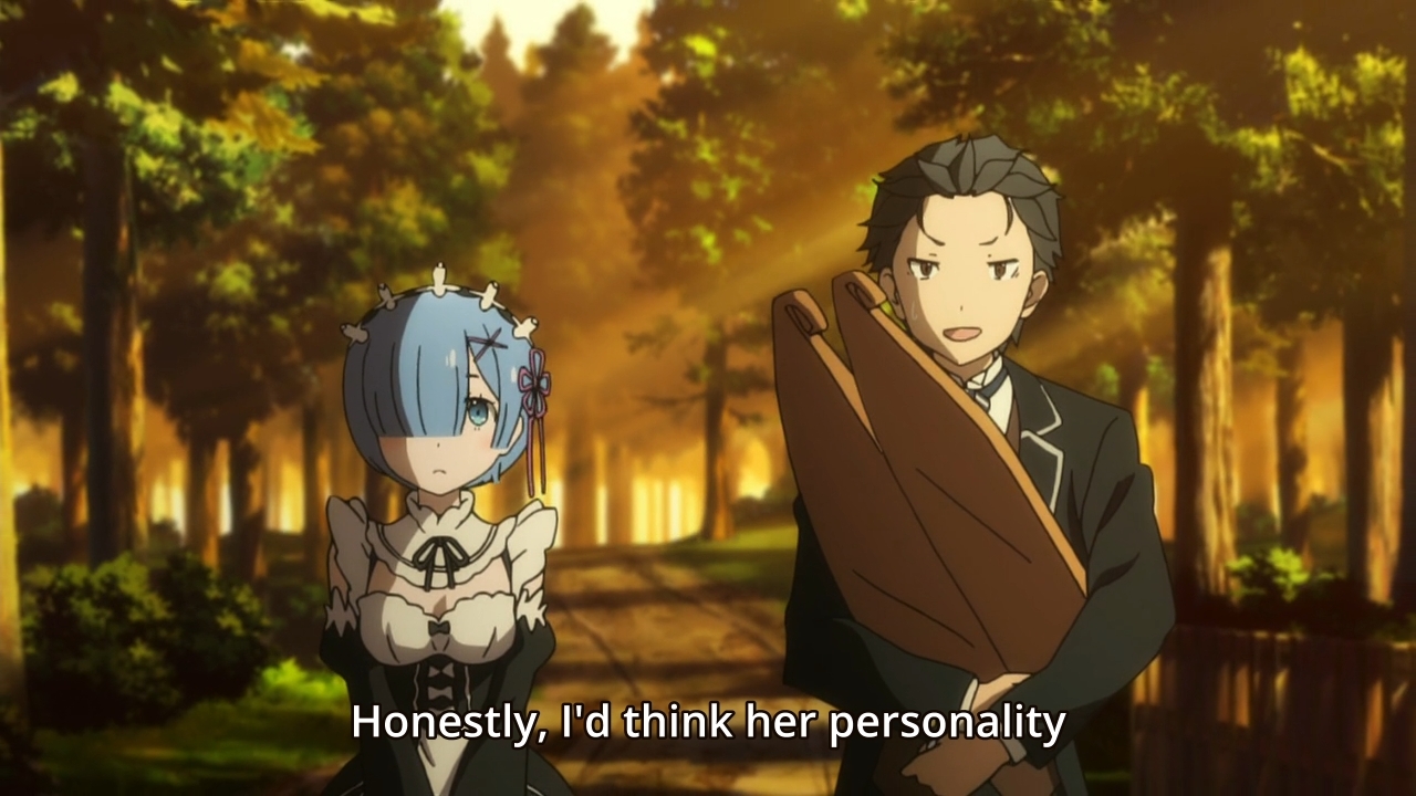 I can’t help but feel that Re:Zero has squandered its potential. But this is what people want. They want a pseudo-dating sim sprinkled lightly with some “dark” moments every now and then. That’s not my thing. I don’t give a shit about Emilia. I don’t give a shit about Ram or Rem. I definitely don’t give a shit about Subaru. I just want to see the time loop mechanic utilized in an interesting way. But again, it’s been reduced to an afterthought in this week’s episode. It’s buried beneath all this slice-of-life nonsense, and I only have myself to blame for not watching this episode at 2x speed.
