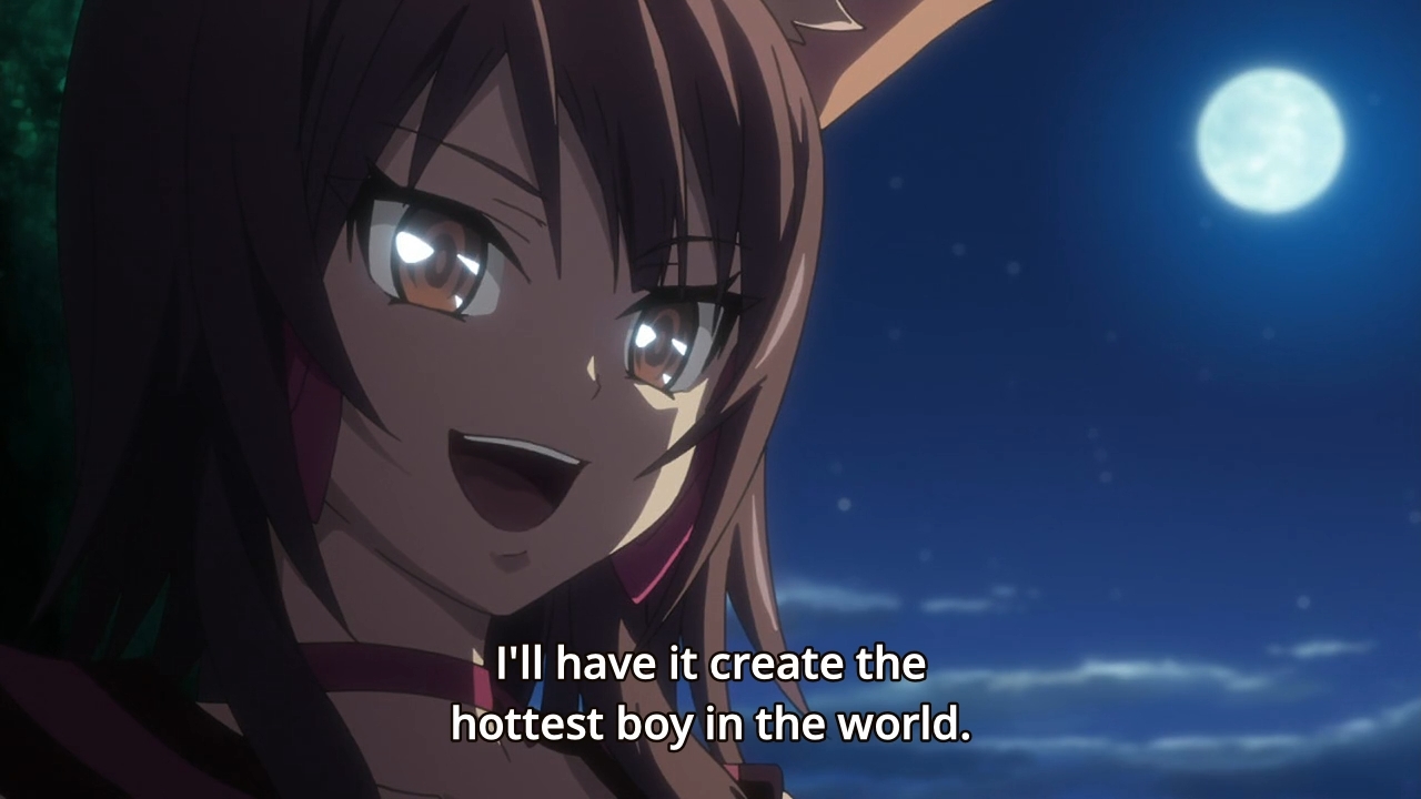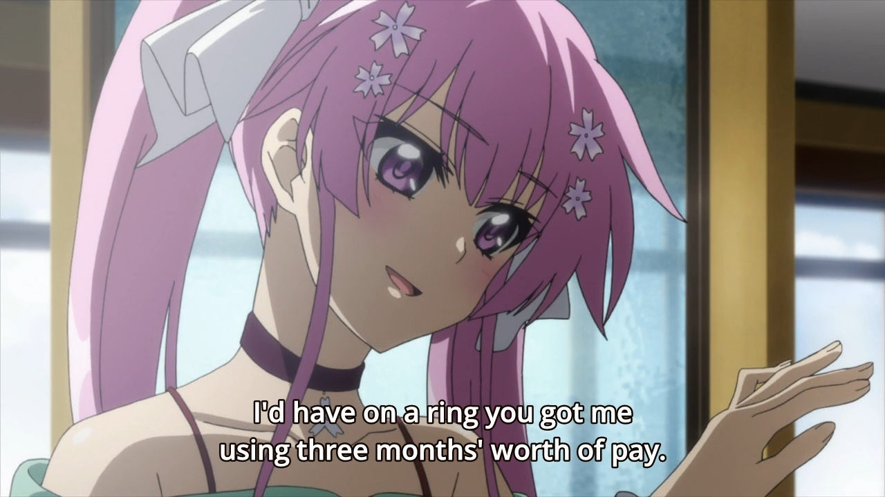 I haven’t touched either of these two shows in quite a few weeks, so in theory, it would make sense for me to fill you in on what has happened while we’ve been gone. But the truth is that these shows are ass, so there’s not much to cover. In Hundred, we’re still in that early process of meeting all of the haremettes. At the same time, you learn that Hayato is a Variant, which means he’s half Savage, half human. It’s as dumb as it sounds; he’s super strong in battle, but he hasn’t quite learned how to control himself yet. To quell the beast inside him, Emilia has french kiss him. Nope, you didn’t misread that. They literally swap germs in order to pacify the hero when he goes berserk. Sigh… currently, Hayato is tasked with guarding some famous idol.