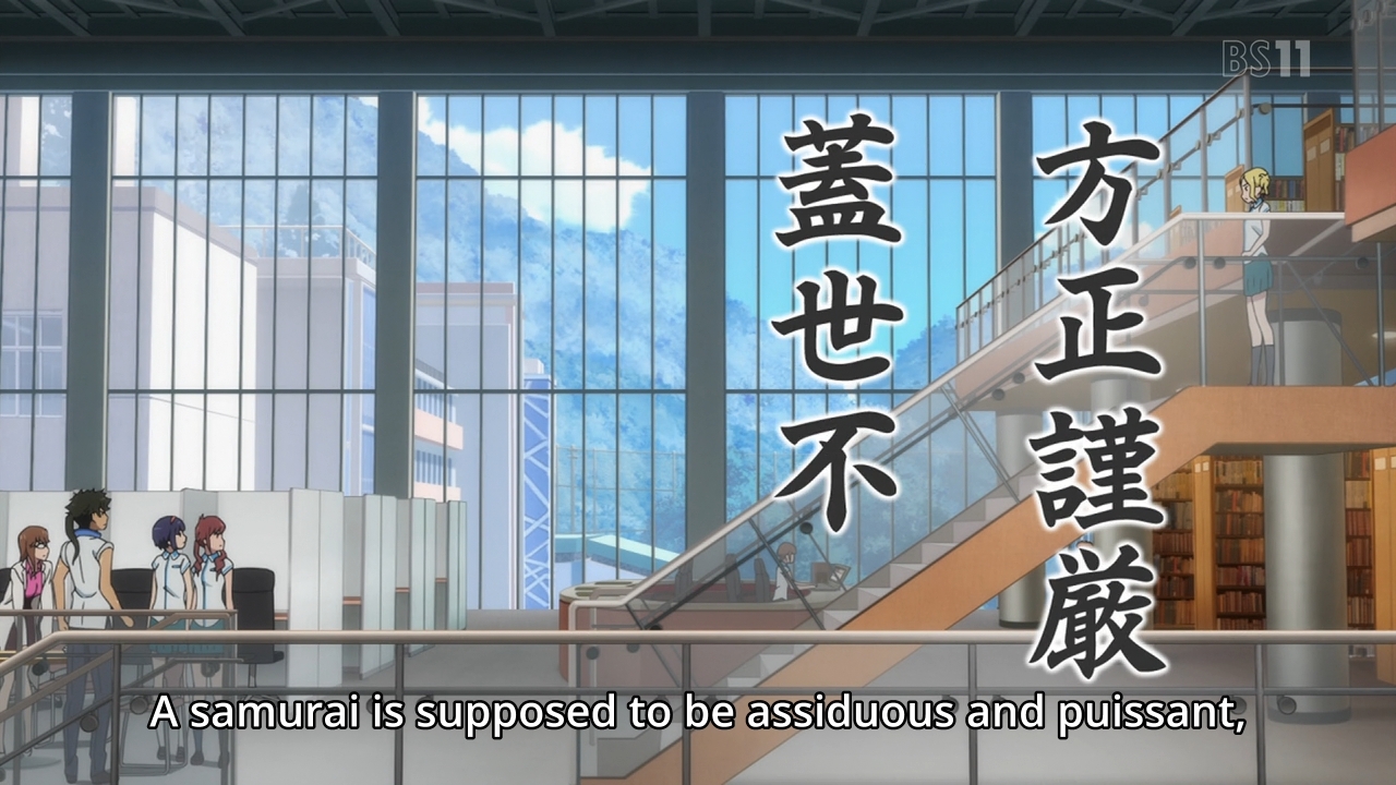 Well, we all knew this episode was coming, and I can’t say I’m thrilled at the prospect of it. I wrote last week that I’m interested in seeing how our anachronistic hero would adapt to modern life, but that doesn’t necessarily mean we have to send him to school. But this is anime, so what else can we expect? Don’t get me wrong, though. For the most part, this is an okay episode. It’s not Kuromukuro’s best, but it’s not bad. And of course, PA Works has never struck me as the most daring or the boldest studio out there. So again, we knew a school episode was coming. Luckily, some action does kick in during the last quarter of the episode, but until then, we simply have to endure a few rather obligatory scenes. As such, I’ll deviate from my usual format in order to cover this week’s episode.