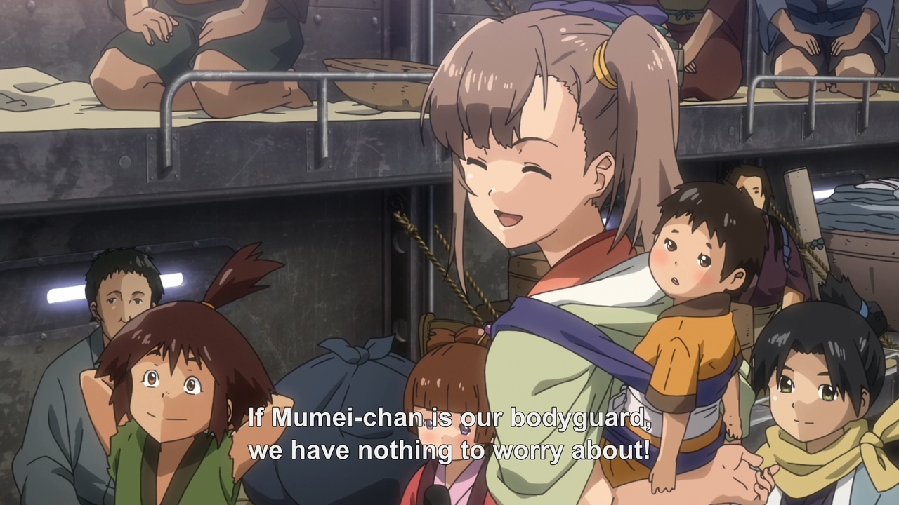 She is stupid, but I think the writing is a problem too. Shoehorning this new guy just to stir shit up seems like a pretty unpolished idea. Besides, what he said (and Mumei’s reaction to it) doesn’t make any sense. Mumei’s mission is to get to a place called Kongokaku. Supposedly, her “brother” sent her there for some reason. But how does putting herself in needless danger help her accomplish that mission? Besides she needs the train to get there, which means it’s in her best interest to play nice with the people, which she seemed to have understood at the end last episode. So where is all this shit coming from now? It feels like a step backwards on her character arc, and a waste of time they could use advancing the plot instead.