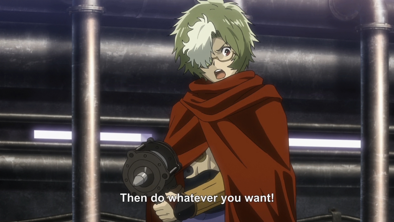 Our heroine receives a rather ominous warning in this week’s episode: “Fulfill your mission, Mumei. While you’re still human.” What is Enoku trying to say here? Let’s break it down. At first, I took his warning at face value: Mumei will eventually lose her humanity, and once this happens, she will no longer be able to think for herself. Ever since the second episode of the series, the girl has insisted over and over that she is not Kabane. Rather, she is something better; she is Kabaneri, the synthesis of her humanity and her Kabane-like strength. But what if one side is fated to always win out in the long run? As of late, the humans on the train have warmed up to our Kabaneri a tiny bit. They are appreciative of Mumei’s strength, especially since it benefits them. If the girl should ever misstep, however, it’s right back to the same ol’ “She’s just a Kabane after all” spiel. As a viewer, it’s infuriating, because I can’t help but feel as if there’s no logic in this assertion. Just because Mumei said something mean and insensitive to a bunch of kids, that doesn’t mean she is or will ever become a brain-dead Kabane. Ah, but what if these prejudiced humans had been foreshadowing Mumei’s fate all this time? What if it is somehow in Mumei’s nature to eventually succumb to her Kabane side? Well, they say entropy always increases in a closed system…